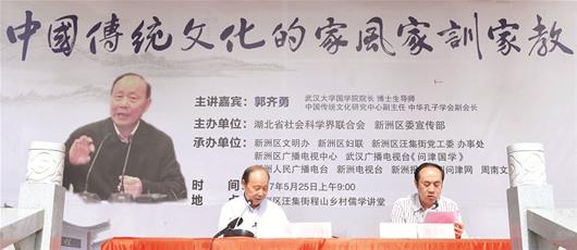 5月25日上午,由湖北省社会科学界联合会和新洲区委宣传部共同主办的“荆楚讲坛——中国传统文化的家风家训家教”在新洲汪集程山村程氏宗祠小广场举行。武汉大学国学院院长郭齐勇主讲,程山村及周边村民500多人聆听了讲座。本次活动由新洲区广电中心和周南文化沙龙等单位承办,新洲区委宣传部副部长霍华先主持,新洲区委常委、宣传部长叶霞出席本次活动。