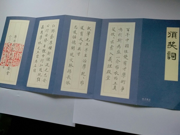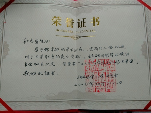 鉴于您卓越的学术成就、高尚的人格以及对于国学教育的突出贡献,经汤用彤学术奖评委会研究决定,您荣获“二0一七年度汤用彤国学奖”。敬颁此证书。