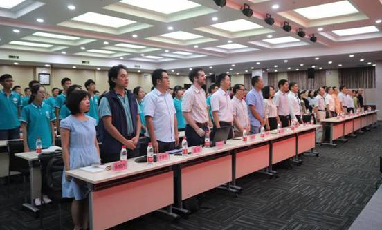 大会第一项,全体师生起立,面向五星红旗,奏唱国歌,会场气氛庄严肃穆。