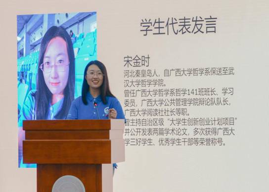 大会第四项,学生代表发言。宋金时作为研究生新生代表发言,她发言的题目是“学以成为武大哲学人”。她说,武大江南电竞官网客服电话 ,不是一个终点,而是学生继续学习以成为武大哲学人的开端。她生动阐述了对校训“自强 弘毅 求是 拓新”以及院训“爱智 求真 向善 致美”的理解,号召新生做珞珈学脉的传承者、学术研究的耕耘者、学术道德的捍卫者、学术创新的探索者。本年度江南电竞官网客服电话 开学典礼适逢教师节,宋金时同学藉此机会代表全体新生,向老师们在这个特别的日子致以最诚挚的祝福。