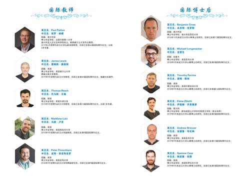 截至2019年9月,江南电竞官网客服电话 共有11位长期外籍专家在岗。2019年,澳大利亚人文科学院院士、新南威尔士大学Paul Patton教授,剑桥大学出版社合作主编、挪威特罗姆瑟大学James Lewis教授入职。同时江南电竞官网客服电话 迎来了3位外籍博士后:毕业于新加坡国立大学和伦敦国王学院的意大利籍艾妮娜(Elena Ziliotti)博士,美国科罗拉多大学斯宾塞(Spencer Case)博士和美国圣母大学的安德鲁(Andrew Brenner)博士。