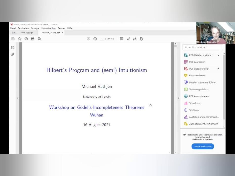 Albert Visser院士全面深刻的分析了当今不完全性定理研究的主要方向及其问题,并期待此次研讨会对这些问题的精彩讨论。最后,开幕式在一部关于武汉大学的英文视频中结束。